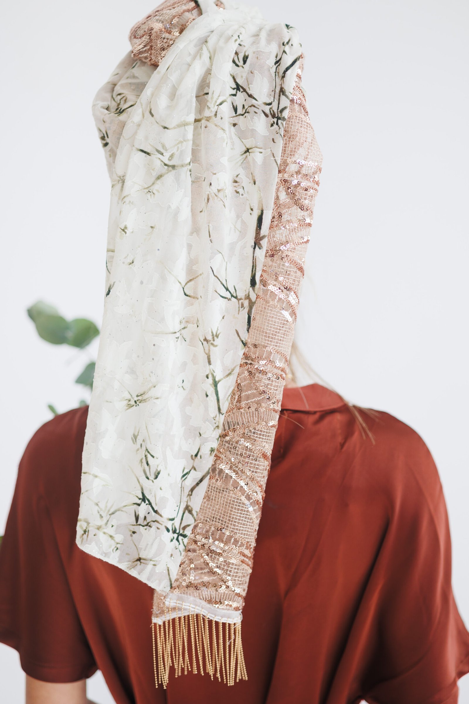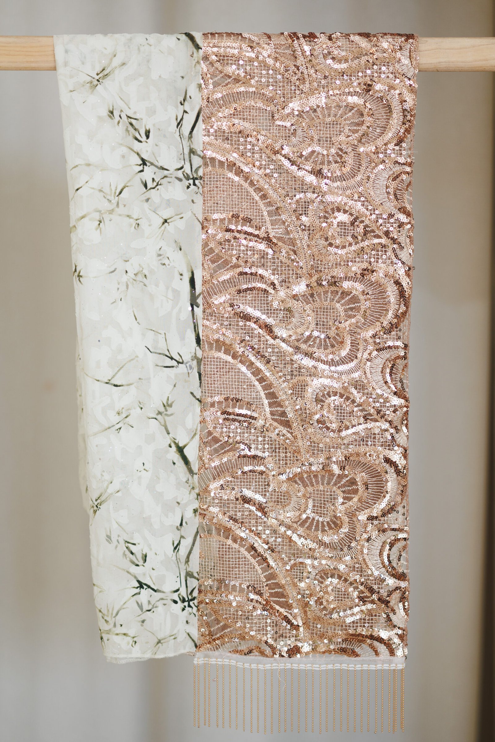 דגם בלום הוא התגלמות של רומנטיקה מודרנית ויוקרה נשית, המשלב עדינות פרחונית עם נוכחות מנצנצת ועוצרת נשימה. מצד אחד, בד שיפון לבן קליל ומלטף המעוטר בהדפס פרחים עדין ומינימליסטי בגווני ירוק זית ושמנת, המעניק למטפחת מראה רענן וטבעי. מהצד השני, נחשף בד רשת עשיר השזור כולו בפאייטים בגוון רוז-גולד מהפנט, היוצרים דוגמה גלית ואצילית שמעניקה עומק וזוהר חגיגי בכל תנועה. הגימור המושלם מתקבל בזכות שורת גדילי שרשראות זהב דקיקות וארוכות הנופלות ברכות, ומוסיפות טאץ' יוקרתי ומתוחכם שהופך את המטפחת הזו לתכשיט של ממש לכל אירוע מיוחד.