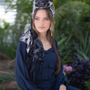 מטפחת בתיה היא בנדנה מלכותית ויוקרתית, המשלבת מרקם עשיר וצבע עז ליצירת נוכחות דרמטית. המטפחת מעוצבת מבד קטיפה רך ועשיר, המספק ברק מט ויוקרתי. הדפוס כולל חברבורות (כתמי נמר) בולטים בגוון בורדו עמוק, המונחים על רקע שחור קטיפתי.