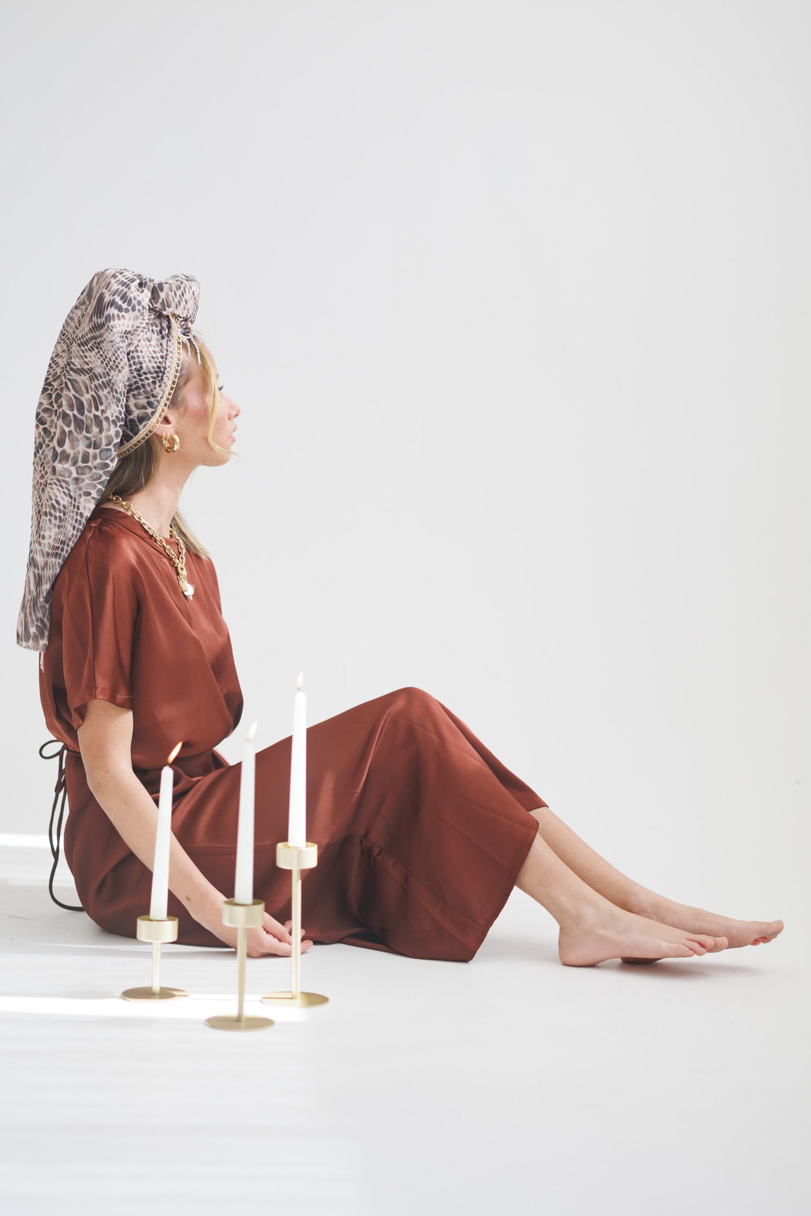 דגם לואי הוא הפריט שיהפוך כל הופעה להצהרה אופנתית בלתי נשכחת, בזכות שילוב נועז ומדויק בין שיק חייתי לזוהר מלכותי. מצד אחד, הדפס נחש דומיננטי בגווני אפור, חום וקרם מעניק למטפחת מראה מודרני, עוצמתי ומלא נוכחות, בעוד מהצד השני נחשף בד רשת עדין השזור בשורות פאייטים מוזהבות בדוגמה גלית ומהפנטת שמושכת את האור. הטאץ' הסופי והיוקרתי מגיע בדמות שרשרת זהב המעוטרת סביב הראש, המוסיפים תנועה וניצוץ של תכשיט יוקרתי לכל קשירה והופכים אותה לבחירה האולטימטיבית למראה ערב מתוחכם ויוצא דופן.