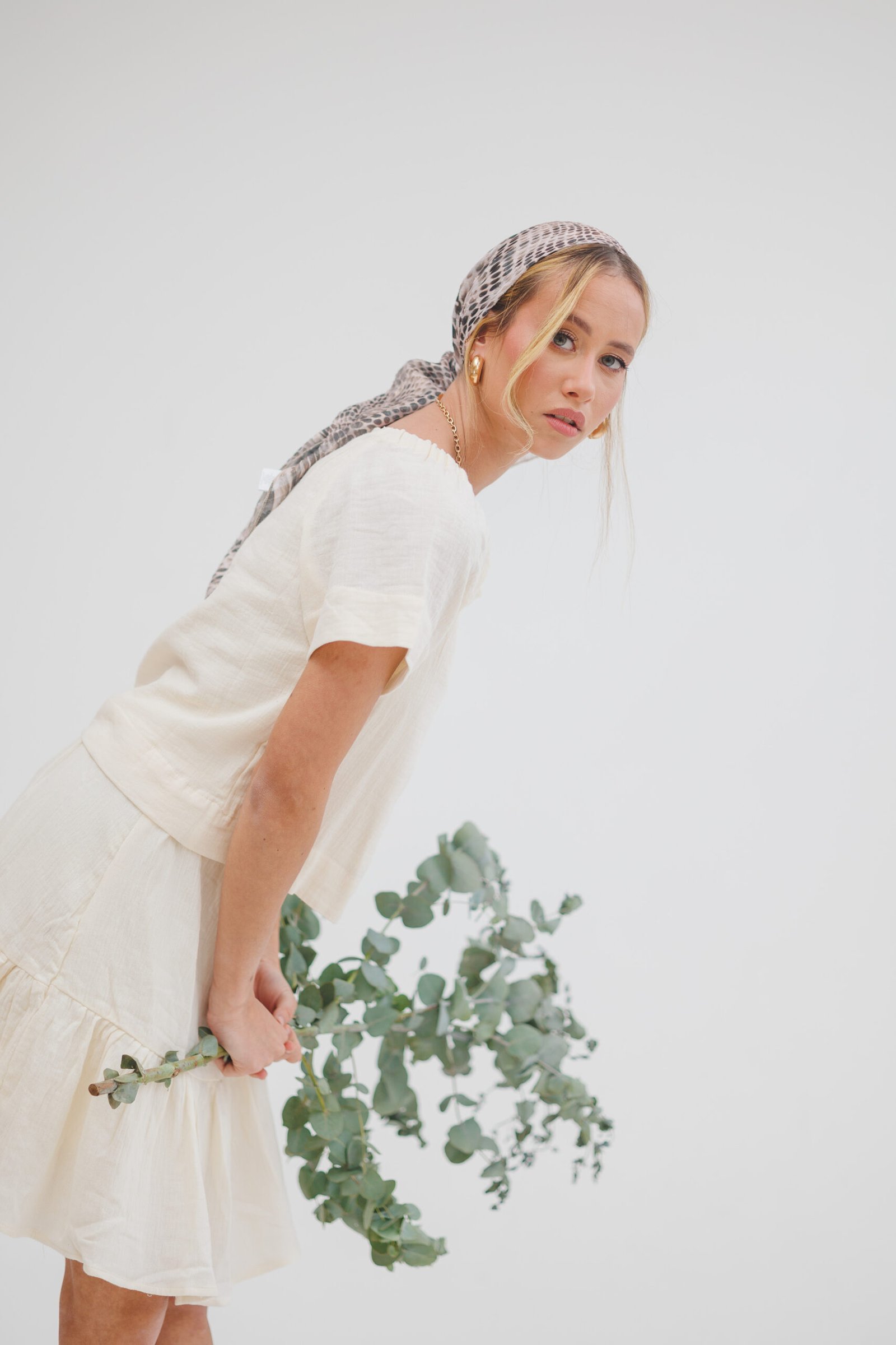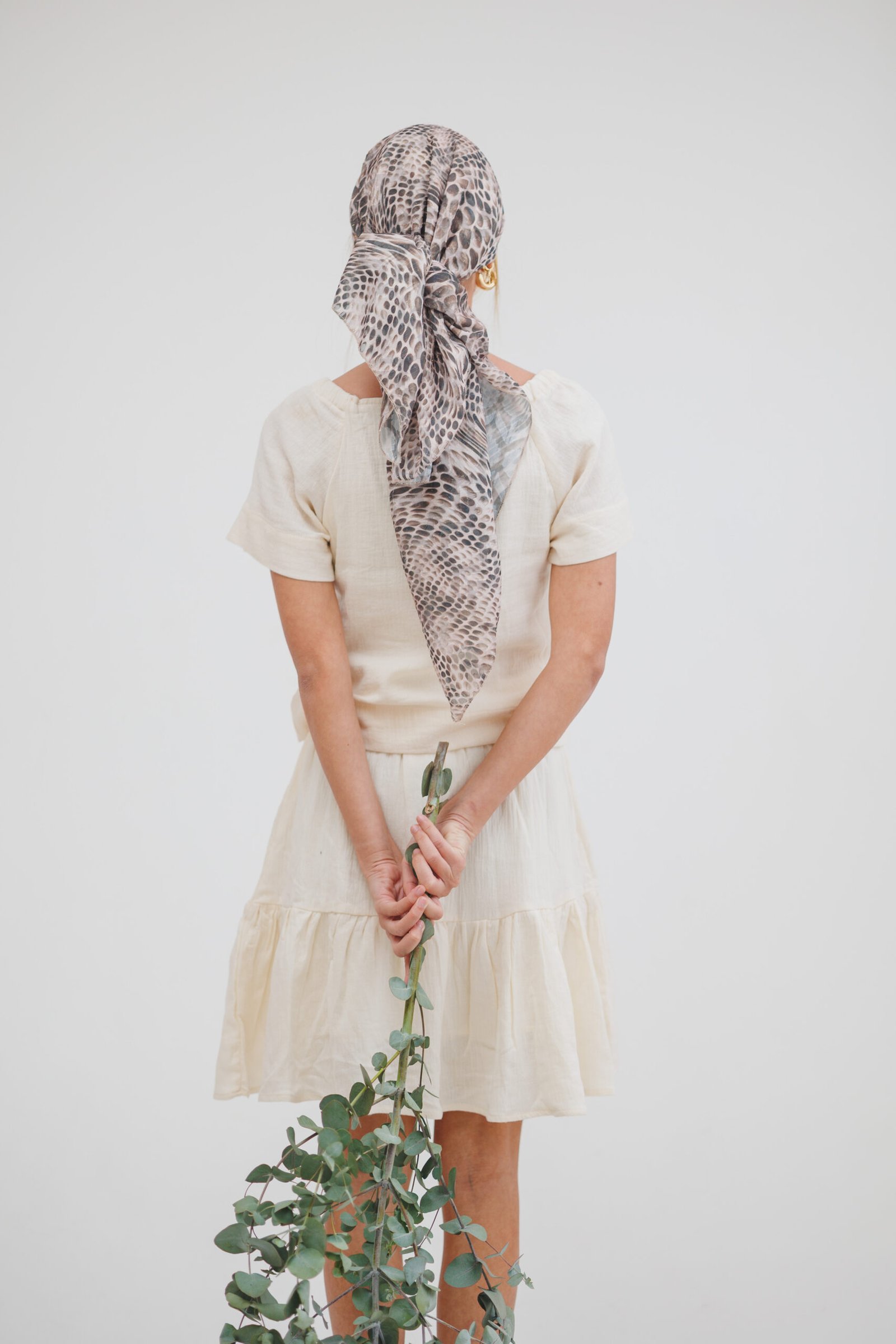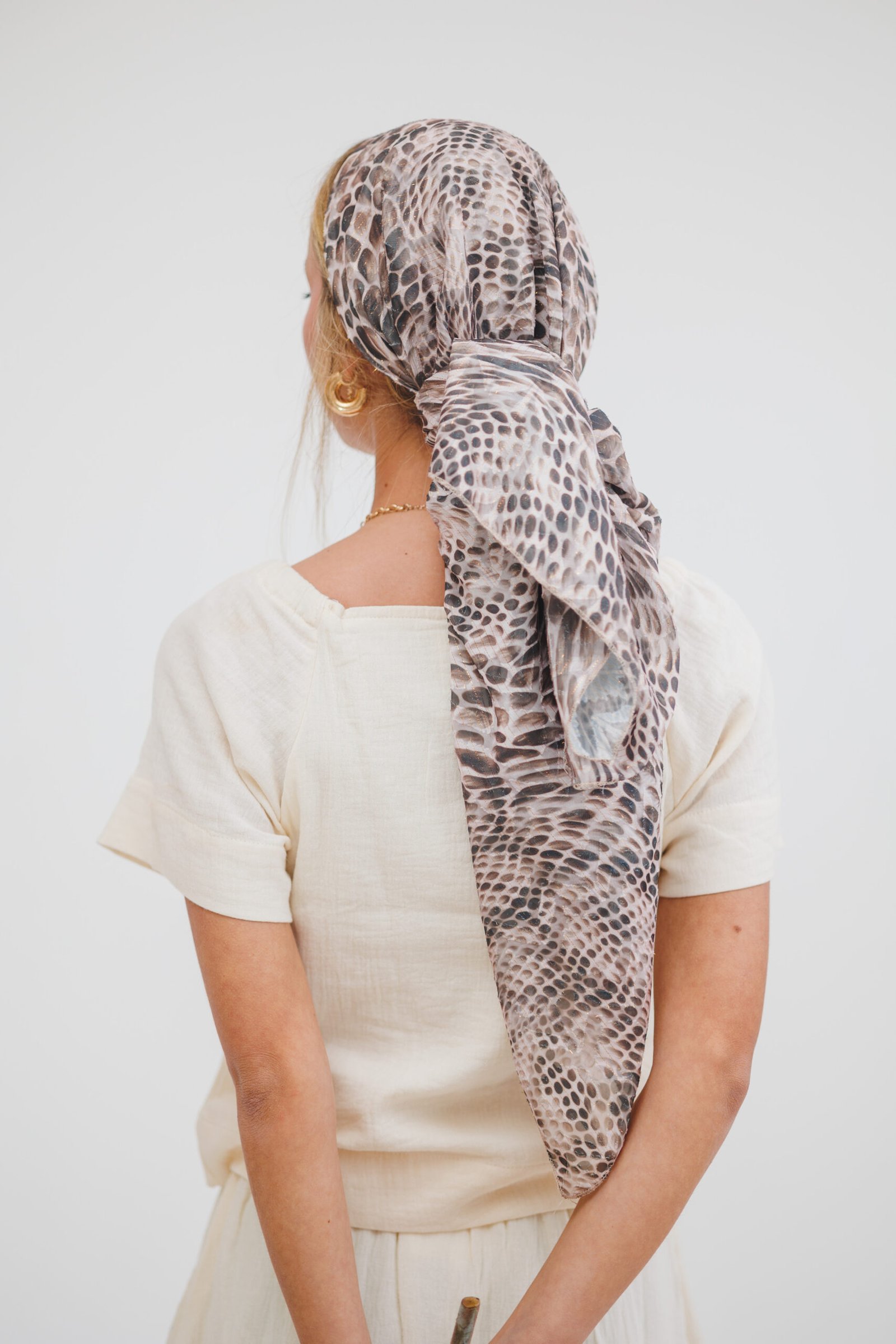 בנדנת מילו – שיק מנוחש ואלגנטיות על-זמנית. הוסיפי טאץ' אופנתי ומלא עוצמה למראה שלך עם בנדנת מילו, המעוצבת בגזרה ריבועית קלאסית לקיפול וקשירה נוחה. הבנדנה עשויה מבד שיפון איכותי ואוורירי המעוטר בהדפס מנוחש בגווני אפרפר, חום חול ושחור, השזורים בחוטי לורקס מוזהבים דקיקים המעניקים לה ברק יוקרתי ועדין. בזכות הבד הקליל והנשפך, היא מתאימה באופן מושלם לכיסוי ראש חלקי, מעניקה נפח מחמיא ומשתלבת נהדר עם הופעה חלקה למראה "סטריט-סטייל" מוקפד או עם לוק ערב אלגנטי
