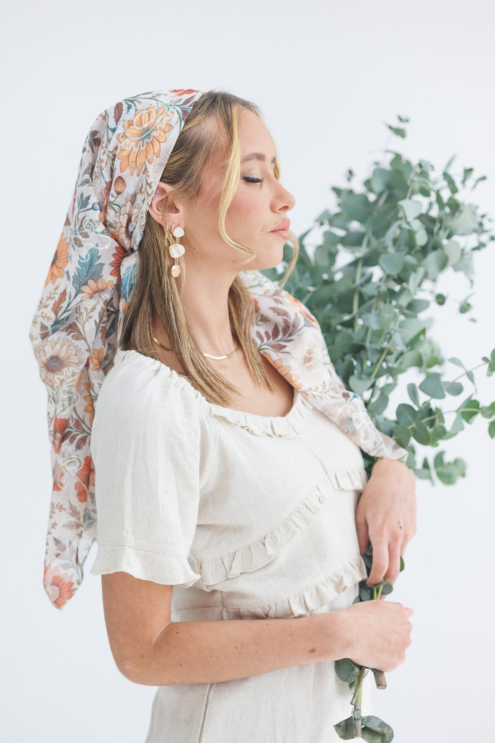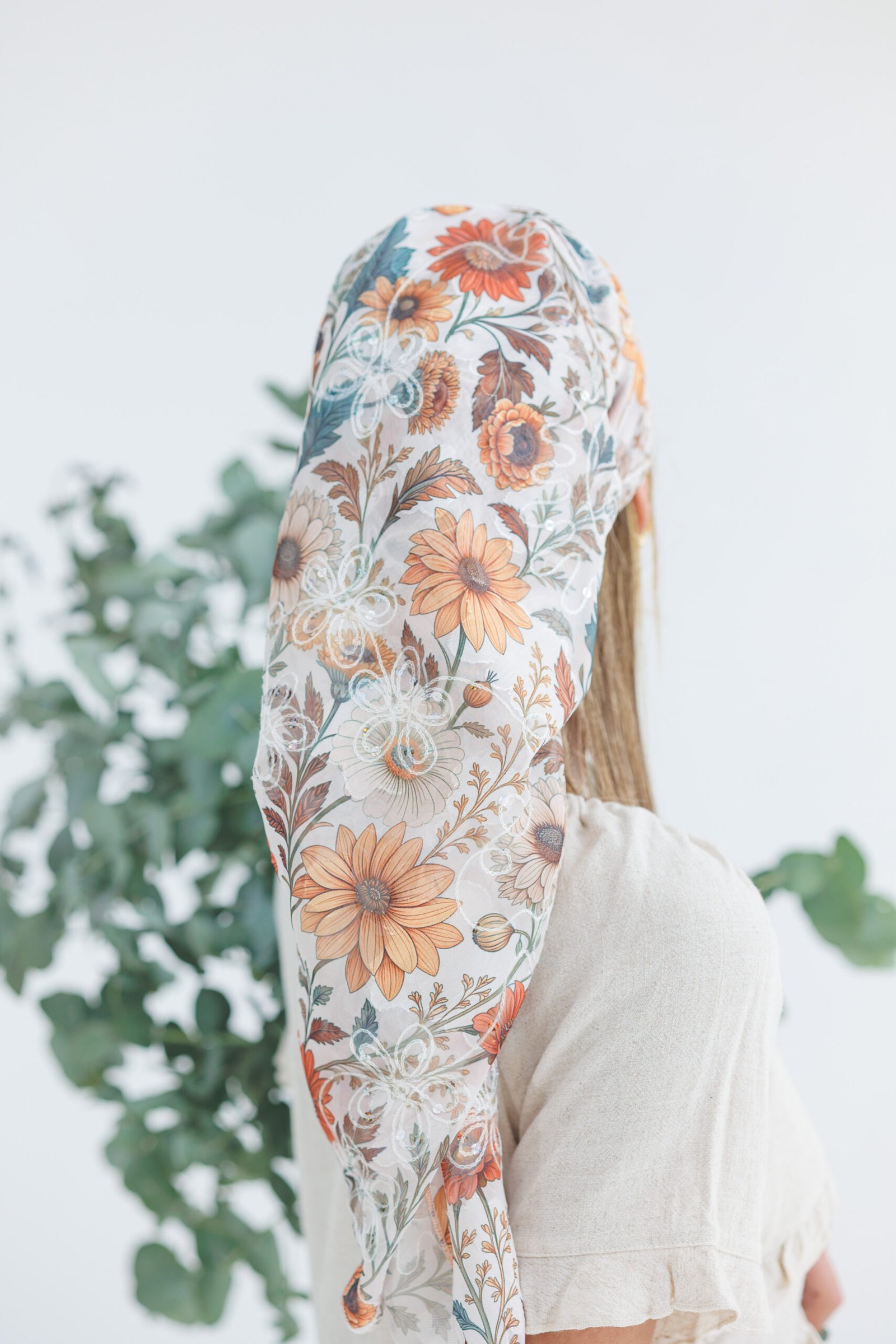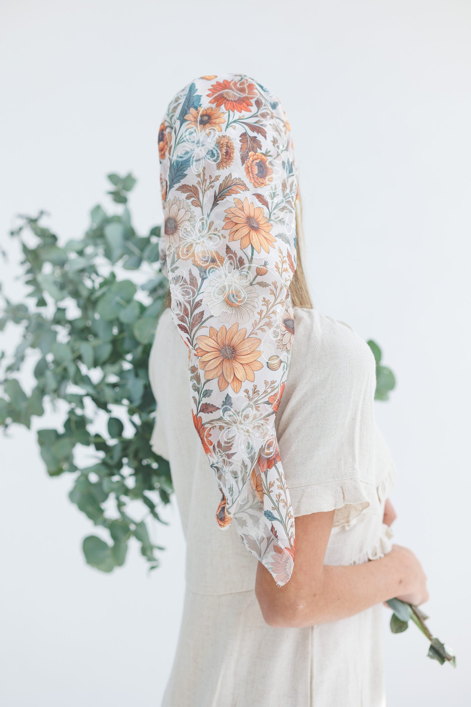 הכניסי אור וסטייל למראה היומיומי שלך עם בנדנת סולי, המעוצבת בגזרה ריבועית קלאסית לקיפול וקשירה קלה. הבנדנה עשויה מבד שיפון איכותי ואוורירי המעוטר בהדפס פרחי שמש וחרציות בגווני כתום חם, חמרה וצהוב-חרדל. מעל ההדפס העשיר משולבת רקמת פרחים לבנה בולטת עם נגיעות פאייטים זעירים, שמוסיפה טקסטורה תלת-ממדית וניצנוץ עדין. זוהי הבנדנה המושלמת למי שמחפשת מראה "בוהו-שיק" חגיגי ונינוח, שיושב ברכות על הראש ומעניק כיסוי חלקי מחמיא ומלא נוכחות.