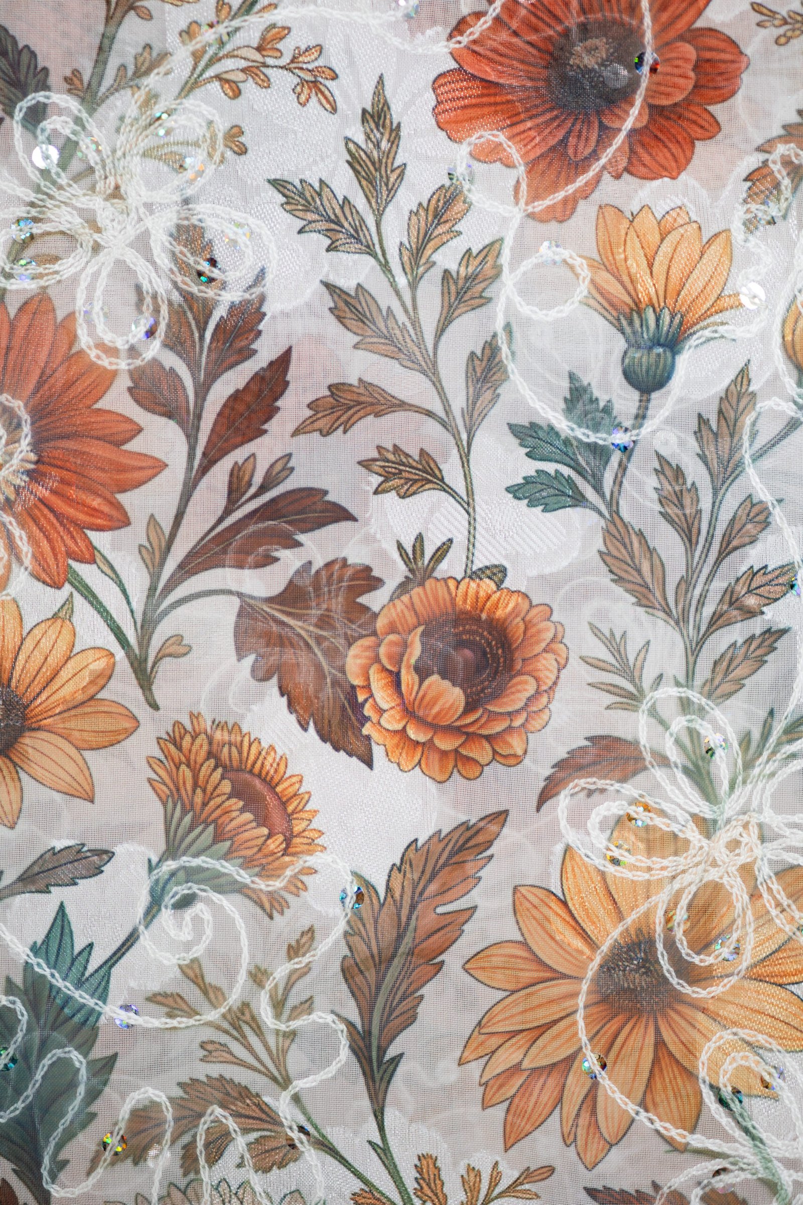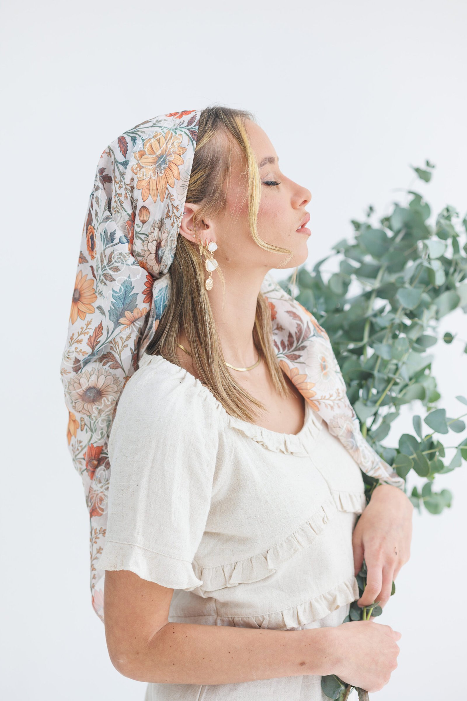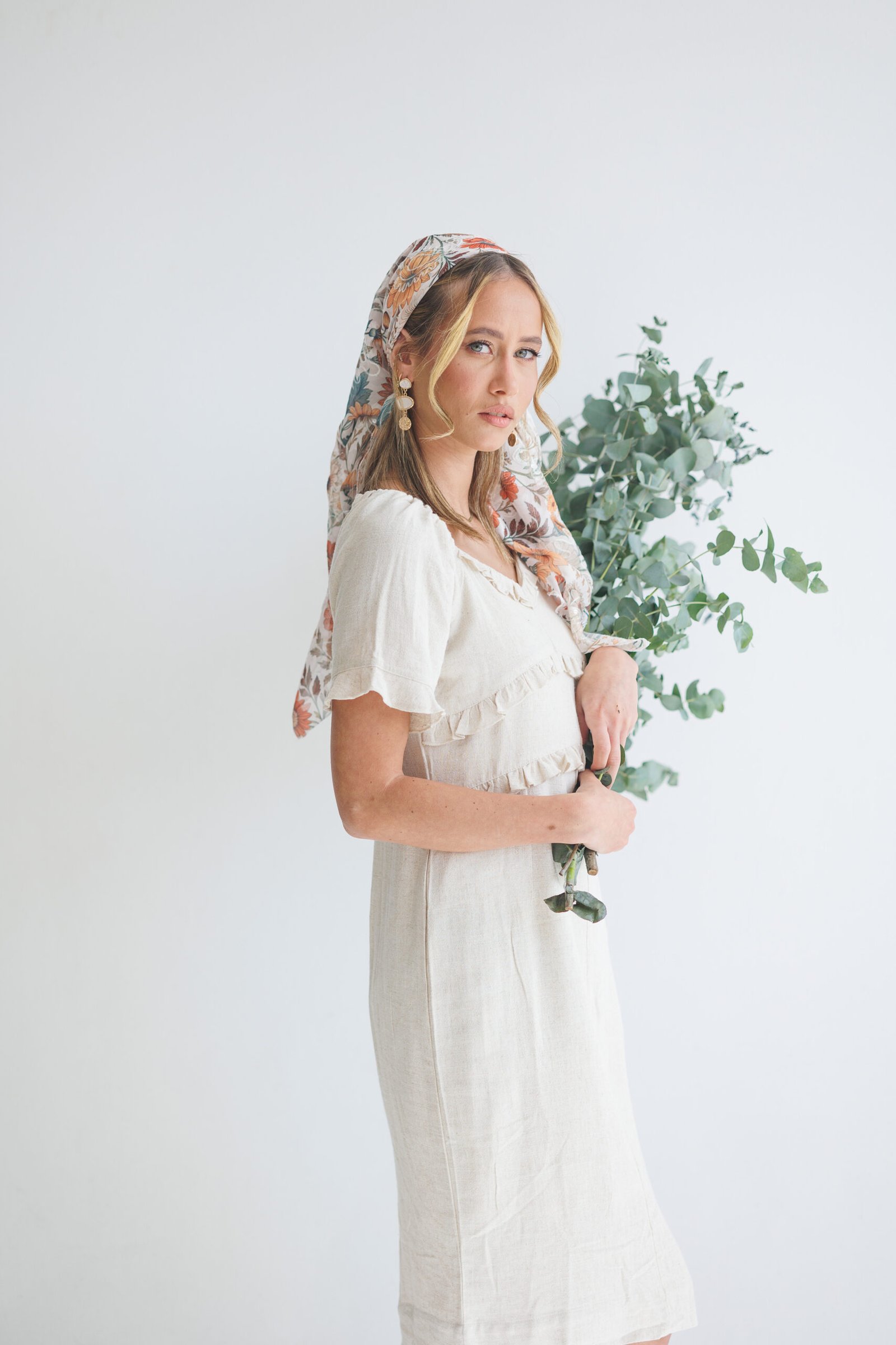 הכניסי אור וסטייל למראה היומיומי שלך עם בנדנת סולי, המעוצבת בגזרה ריבועית קלאסית לקיפול וקשירה קלה. הבנדנה עשויה מבד שיפון איכותי ואוורירי המעוטר בהדפס פרחי שמש וחרציות בגווני כתום חם, חמרה וצהוב-חרדל. מעל ההדפס העשיר משולבת רקמת פרחים לבנה בולטת עם נגיעות פאייטים זעירים, שמוסיפה טקסטורה תלת-ממדית וניצנוץ עדין. זוהי הבנדנה המושלמת למי שמחפשת מראה "בוהו-שיק" חגיגי ונינוח, שיושב ברכות על הראש ומעניק כיסוי חלקי מחמיא ומלא נוכחות.