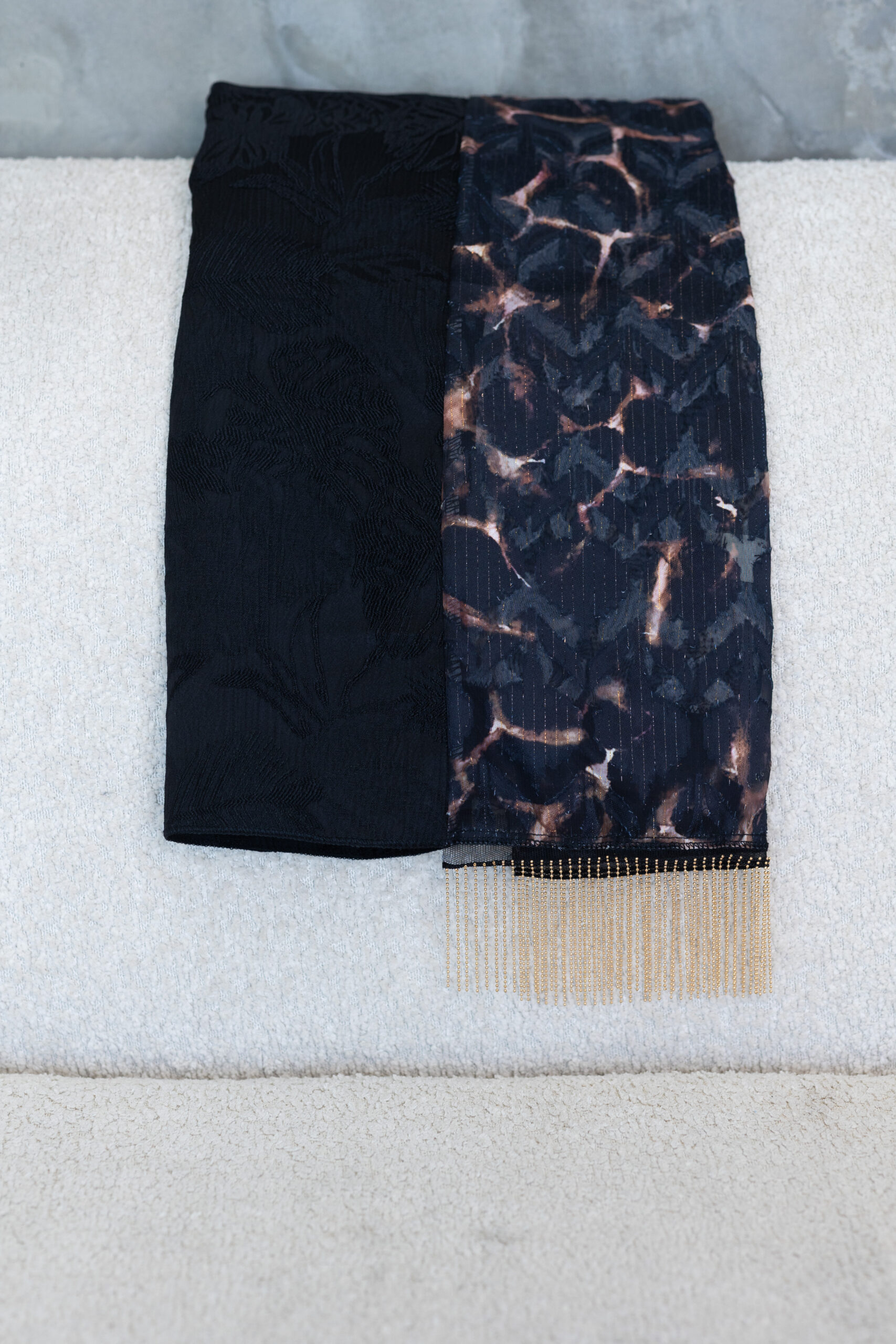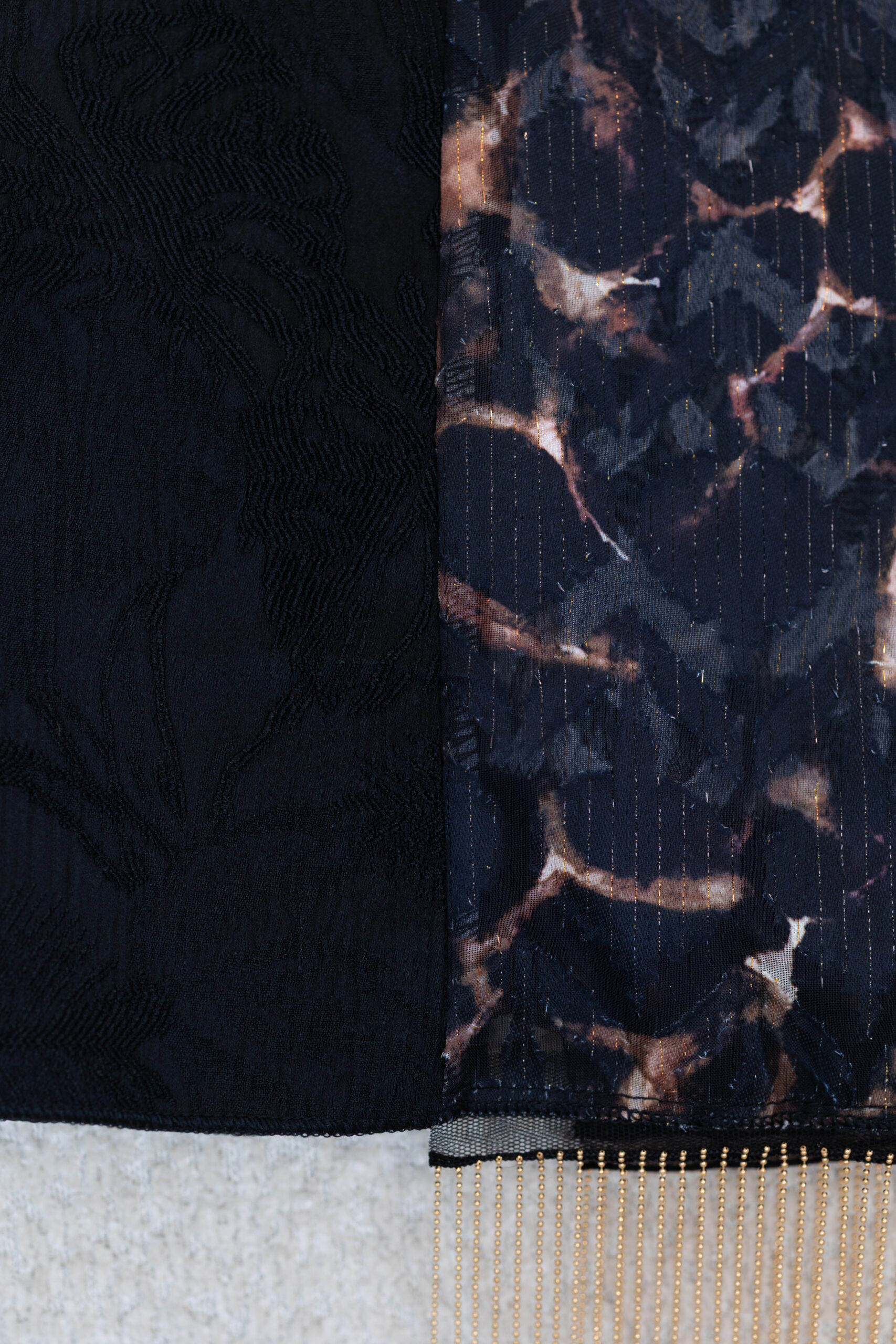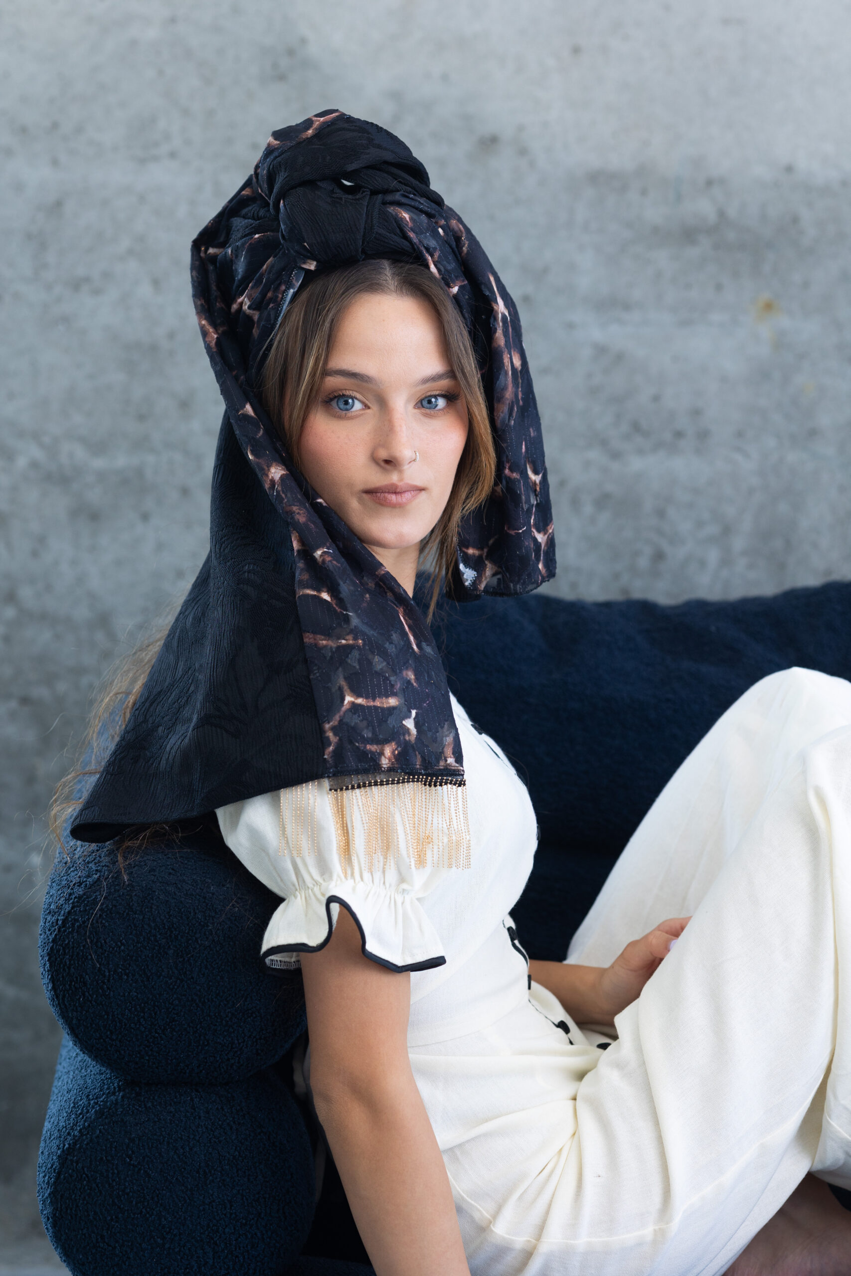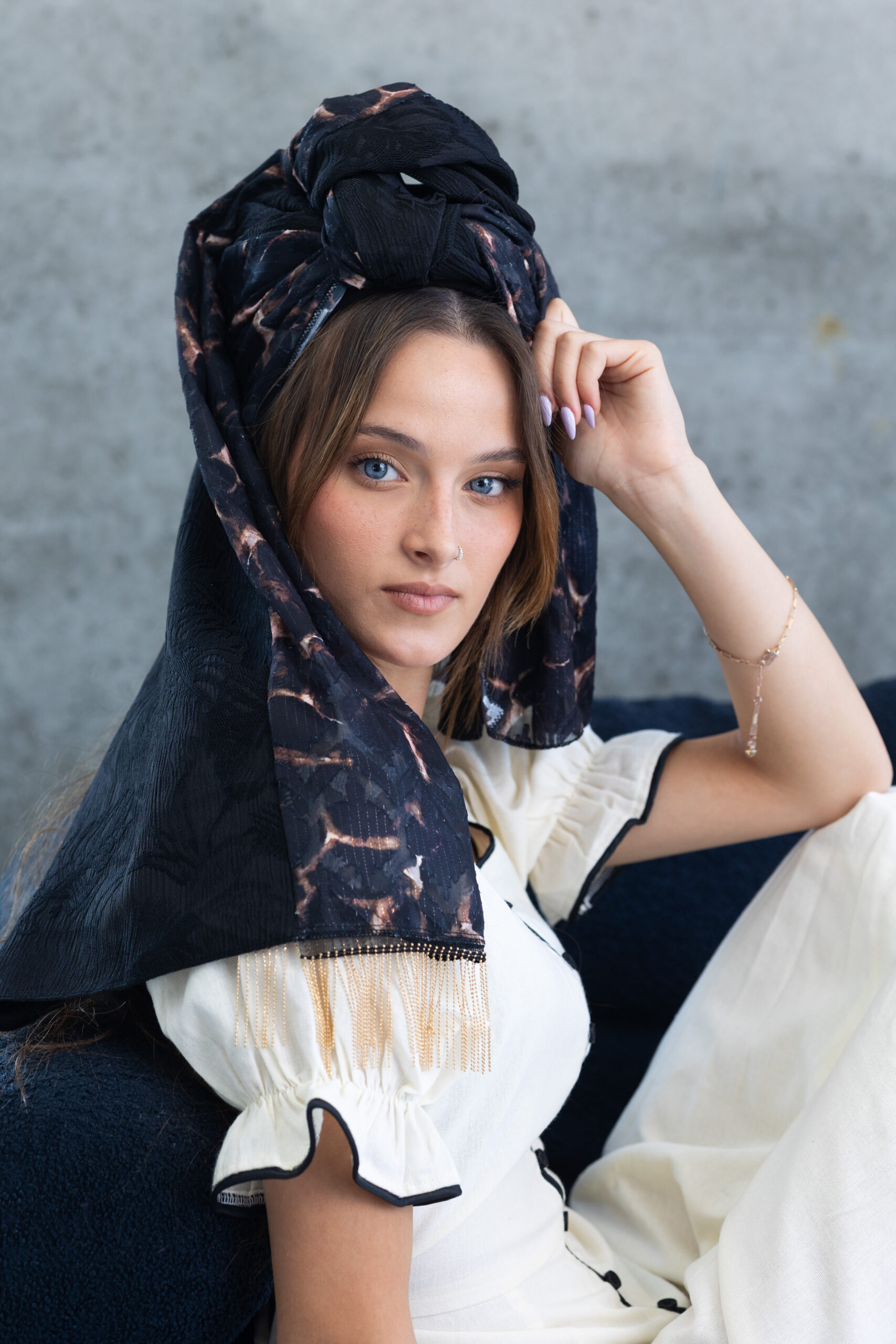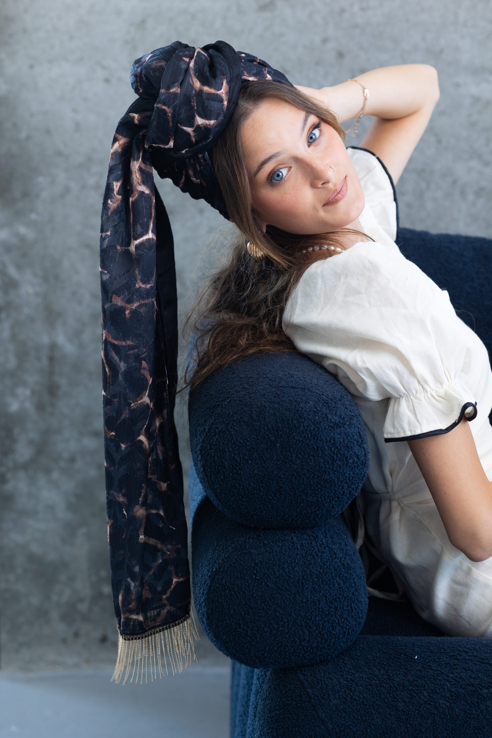 המטפחת משלבת שני בדים שונים שיוצרים יחד מראה מושלם: האחד, בד שחור כהה ובעל טקסטורות נמר מובלטות, שמוסיפה נפח ונוכחות דרמטית. השני הוא בד רך ונשפך שחור עם ריקועי עלים. בקצה פרנז דסקית זהב.