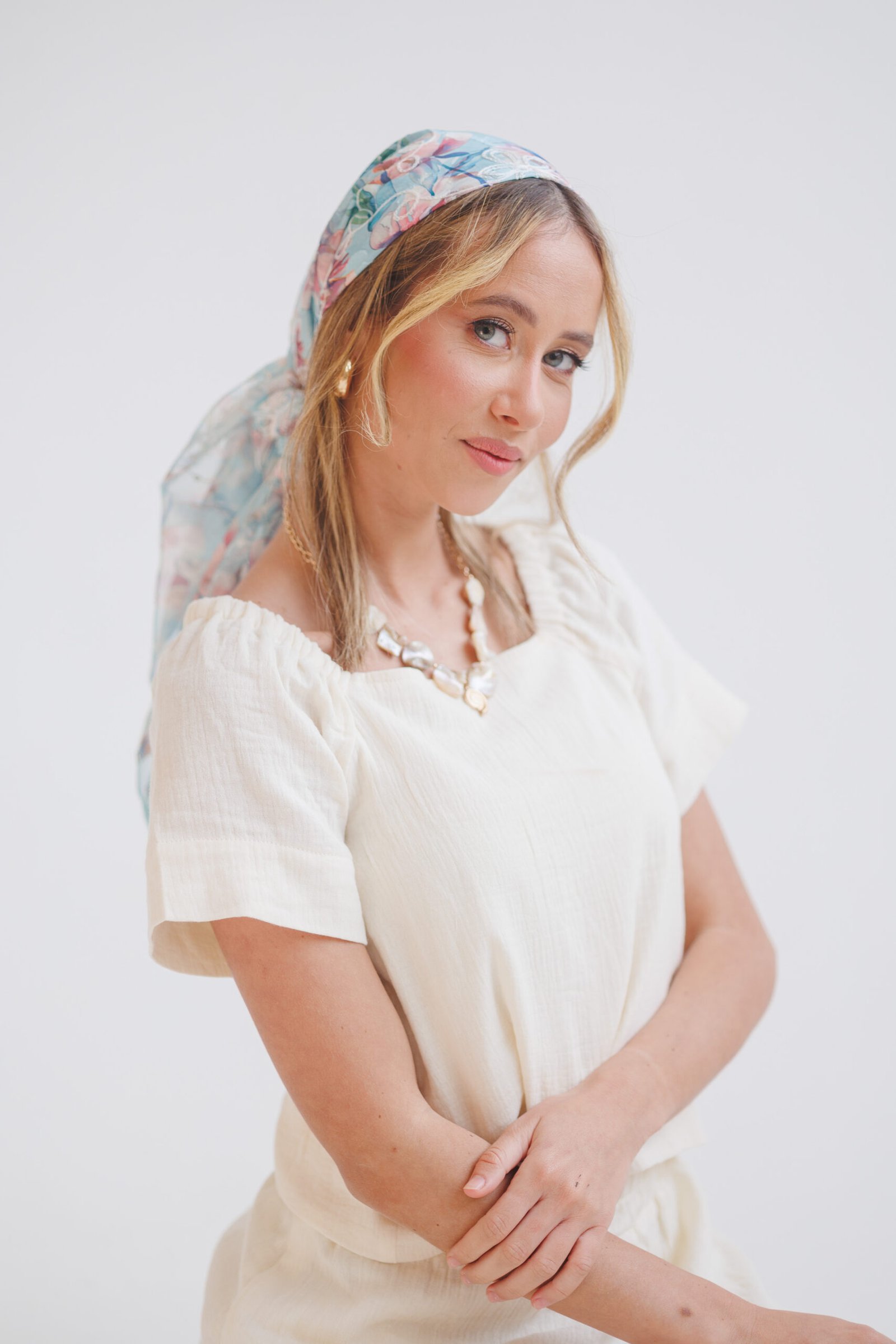 הוסיפי צבע וחיות להופעה שלך עם בנדנת פאפי, המעוצבת בסגנון ריבוע קלאסי לקיפול וקשירה קלה. הבנדנה עשויה מבד שיפון איכותי ואוורירי בגוון תכלת שמיים מהפנט, המעוטר בהדפס פרחי צבעוני-טוליפ ורודים ורקמת פרחים לבנה ובולטת מעל. השילוב בין הבד הקליל לעיטורי הרקמה העדינים מעניק לה טקסטורה עשירה ומראה יוקרתי, מבלי לוותר על הנוחות המקסימלית של כיסוי ראש חלקי ונושם. זוהי הבחירה האולטימטיבית לחול המועד, לטיולי אביב, אירועי בוקר חגיגיים או פשוט כשבא לך להרגיש פורחת ומיוחדת בכל יום מחדש.
