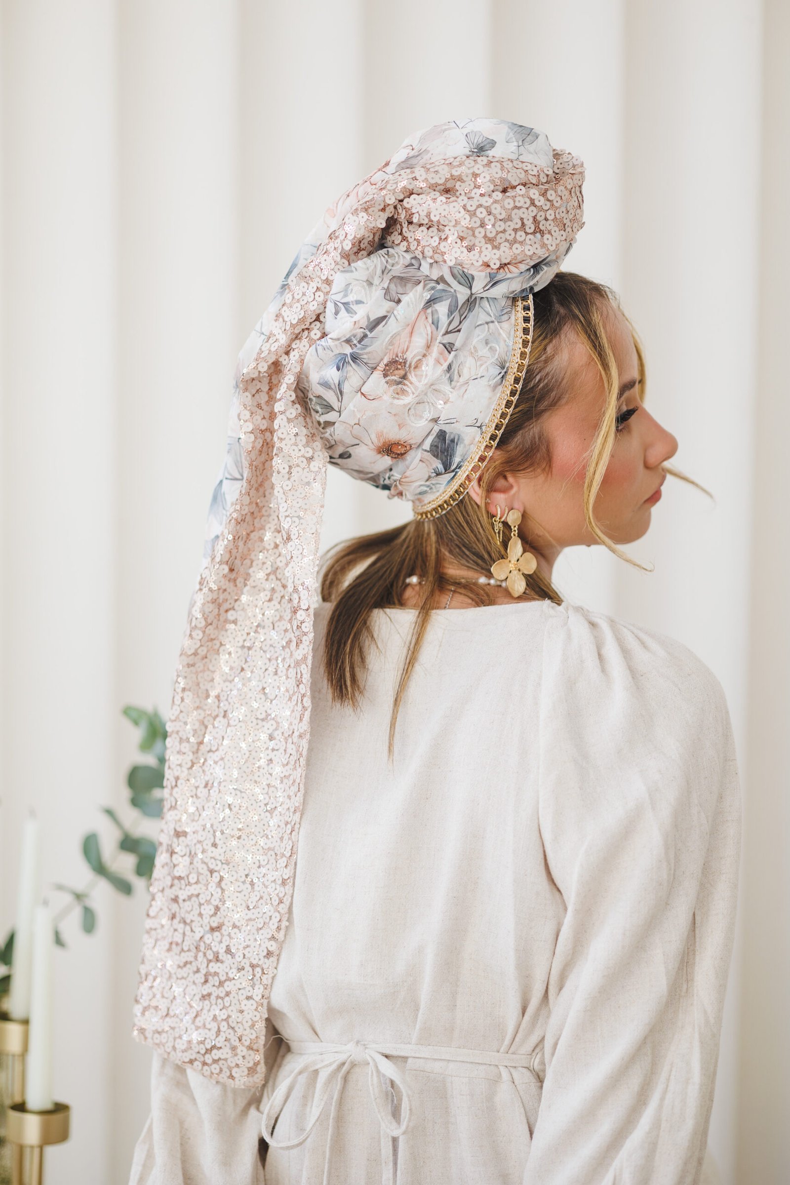 המטפחת הזו היא פריט חובה לכל אישה, בעלת שמחה או למי שמחפשת מראה חגיגי ומואר במיוחד. היא משלבת שני מרקמים מרהיבים: צד אחד עשוי רשת פאייטים צפופה בדוגמת מניפות גיאומטריות בגוון שמפניה-פנינה מנצנץ, וצד שני מבד שיפון עדין בגוון שמנת עם רקמת פרחים תואמת למראה שכבות עשיר ואצילי. במרכזה קיימת שרשרת זהב המעצבת את המטפחת ככתר זוהי מטפחת שמשדרת רוגע, יוקרה וסטייל בלתי מתפשר, ומתאימה לכל בגד חגיגי