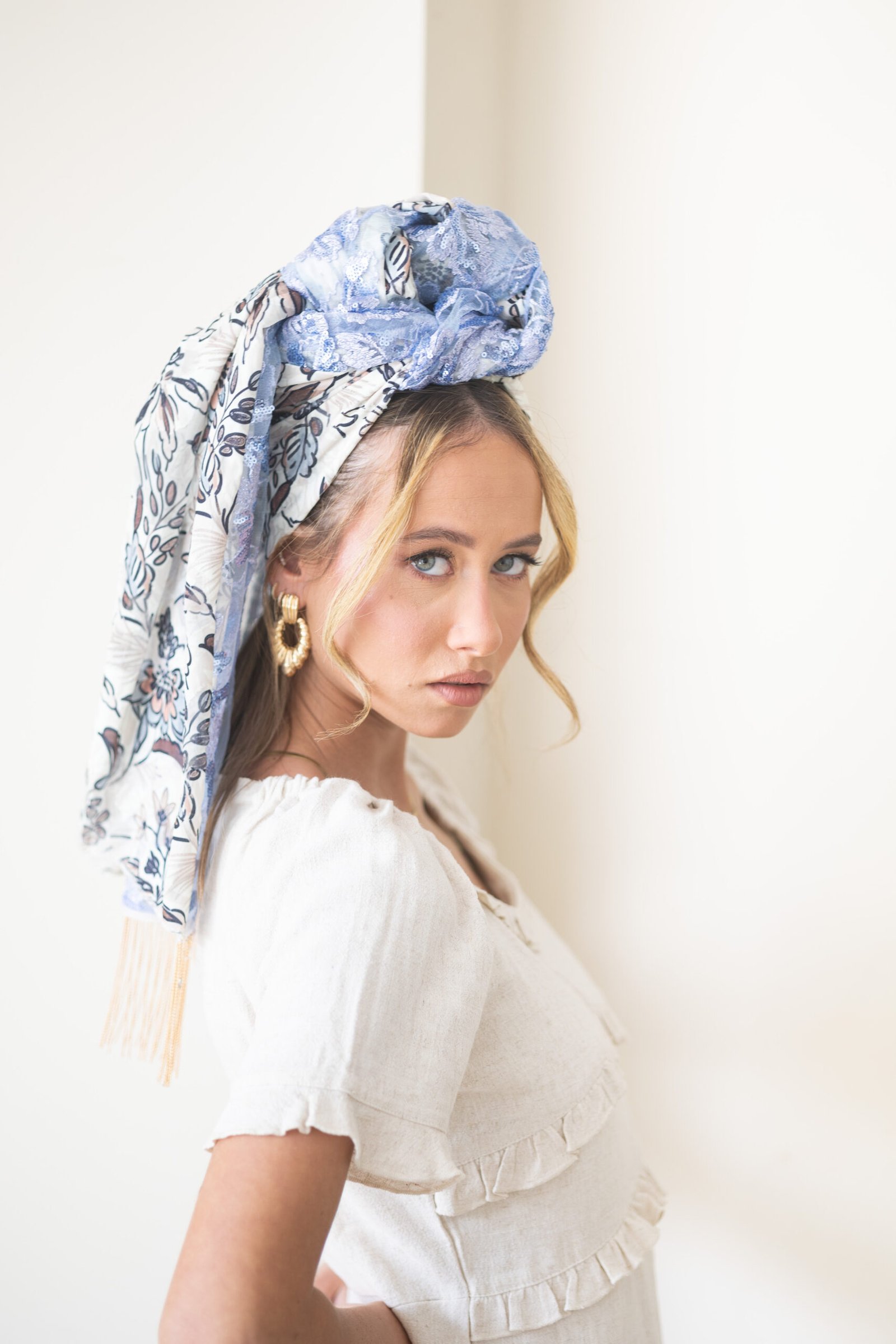 מטפחת פרי היא יצירת אמנות המשלבת בין רכות פרחונית לזוהר מנצנץ, למראה יוקרתי ומלא נוכחות. המטפחת מעוצבת משני פאנלים משלימים: צד אחד עשוי בד רשת עדין בגוון תכלת-סגלגל, המכוסה ברקמת פאייטים עשירה בדוגמת עלים ופרחים המנצנצים בעדינות בכל תנועה, וצד שני מבד בהדפס איורי קלאסי בגווני כחול נייבי, קרם ונגיעות חמרה. השילוב בין הטקסטורה המבריקה להדפס הווינטאג'י יוצר איזון מושלם, וסיומת הפרנזים המוזהבים מעניקה את הטאץ' הסופי והחגיגי שהופך כל קשירה למלכותית.