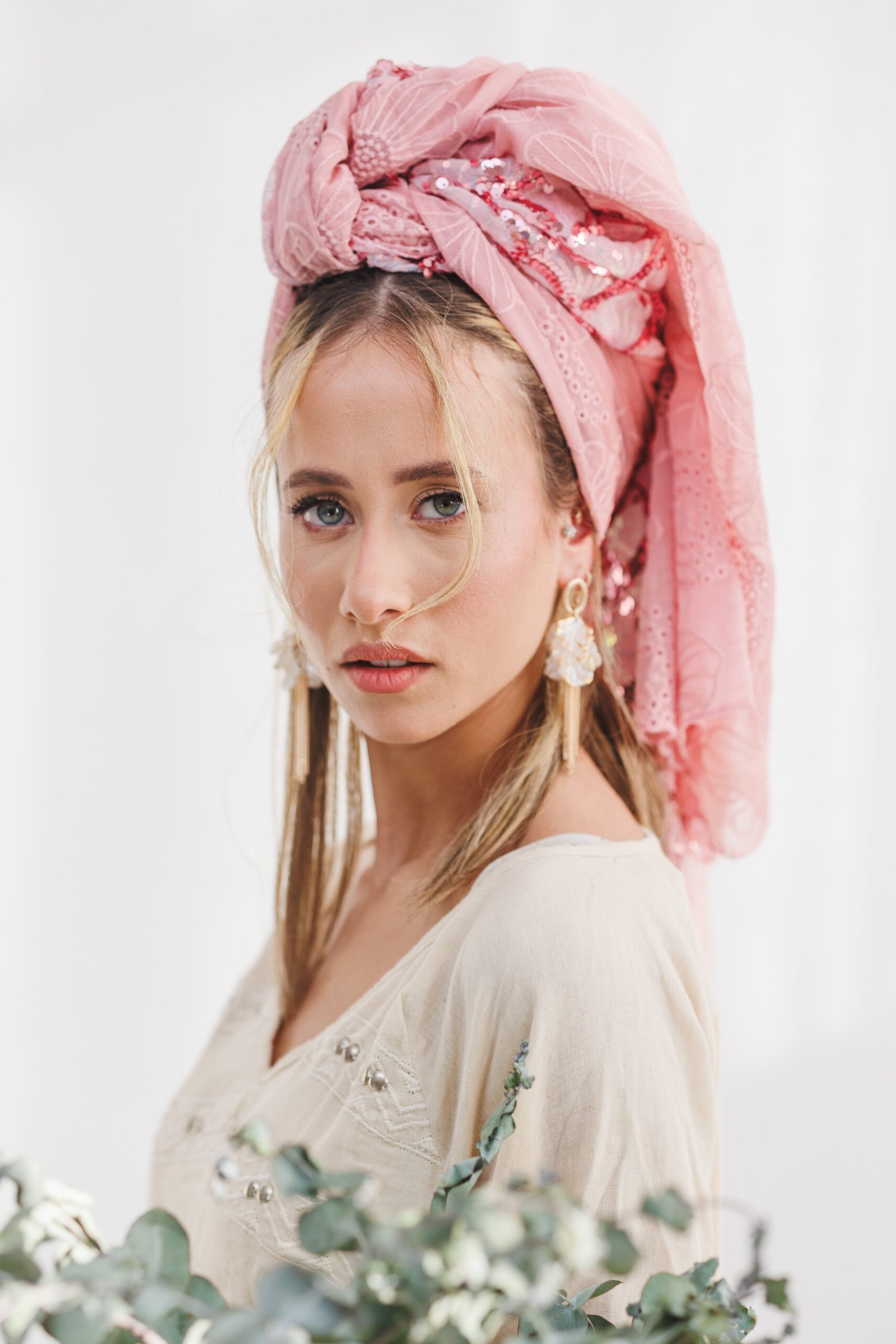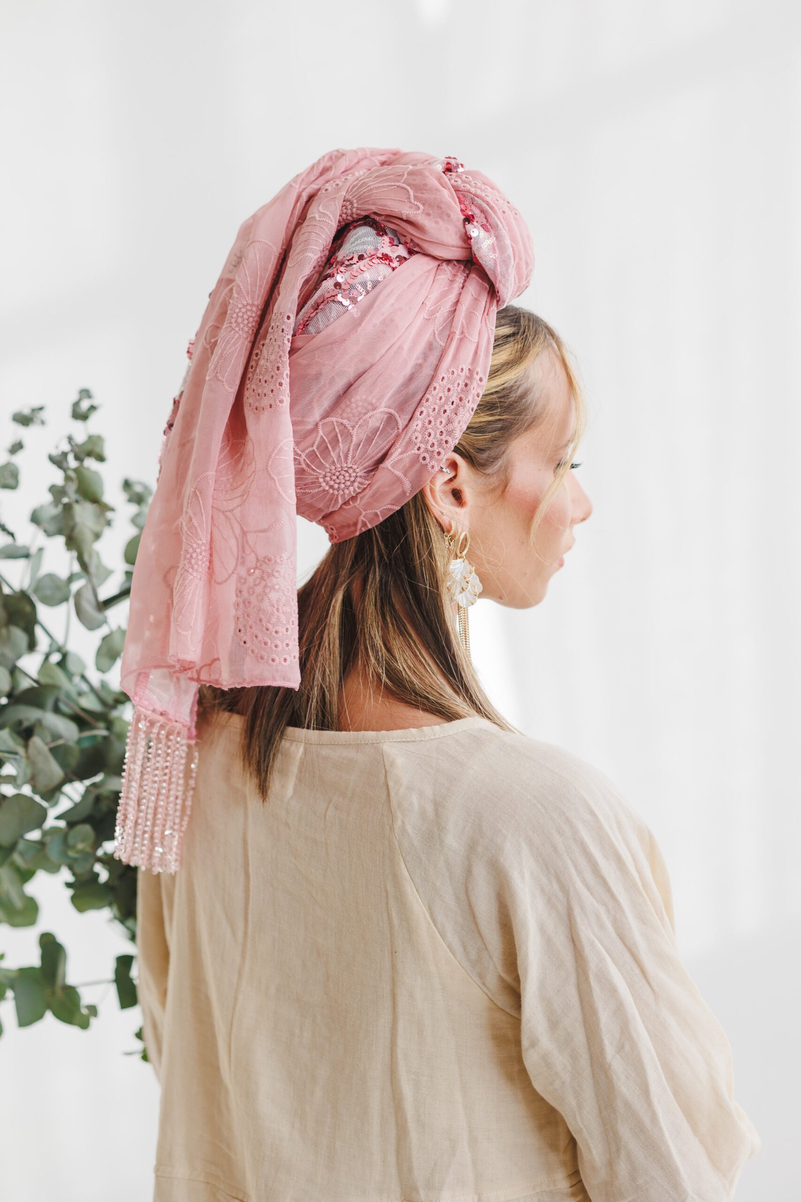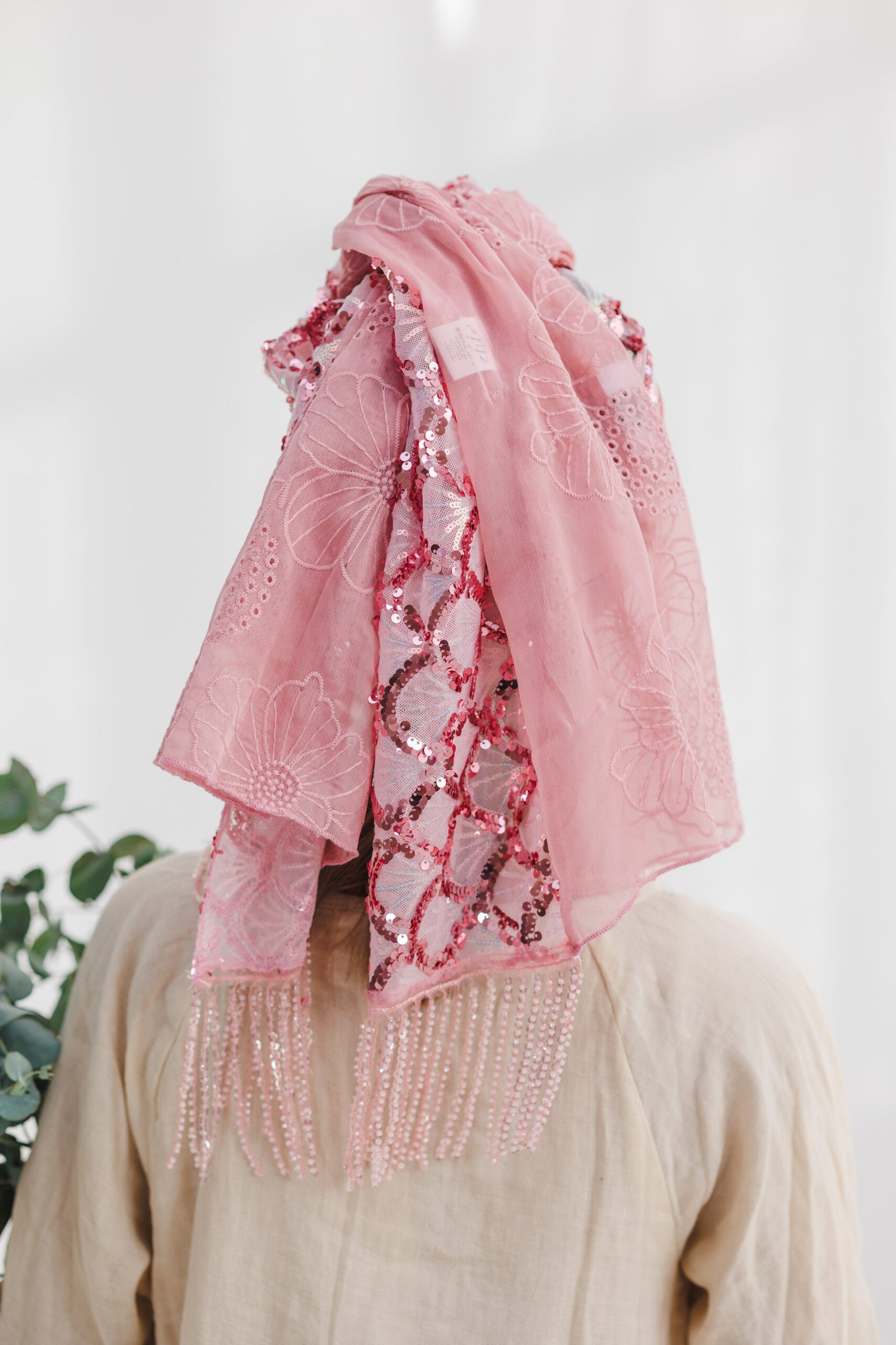 המטפחת מגיעה בגוון ורוד פינקי רך ומחמיא, המשלב עבודת יד עשירה ומרקמים משתנים. חלקה האחד מעוטר בפאייטים צפופים בדוגמת רשת גיאומטרית מנצנצת, וחלקה השני עשוי בד שיפון-אורגנזה קליל עם רקמת פרחים עדינה טון-על-טון. השילוב בין הנצנוץ העז לבין הרוך של הרקמה יוצר מראה הרמוני ויוקרתי, שמתעורר לחיים בזכות סיומת של גדילי חרוזים ארוכים המעניקים תנועה ואלגנטיות לכל קשירה. זוהי הבחירה המושלמת לקולקציית האביב, שמעניקה לך מראה רענן, נשי ומלא נוכחות.
