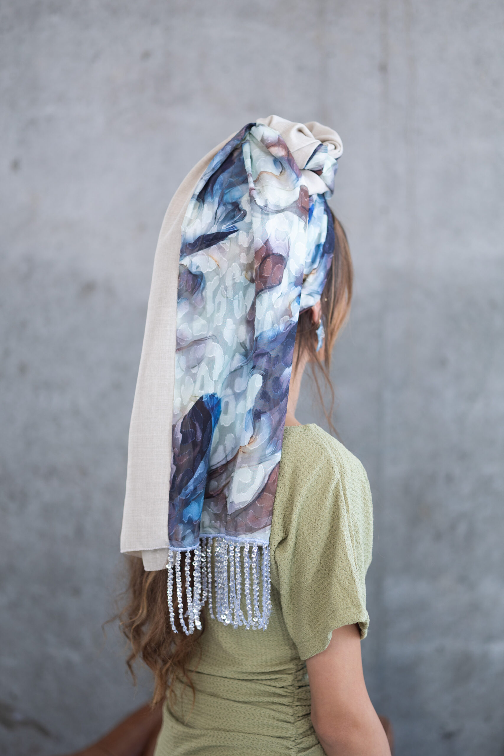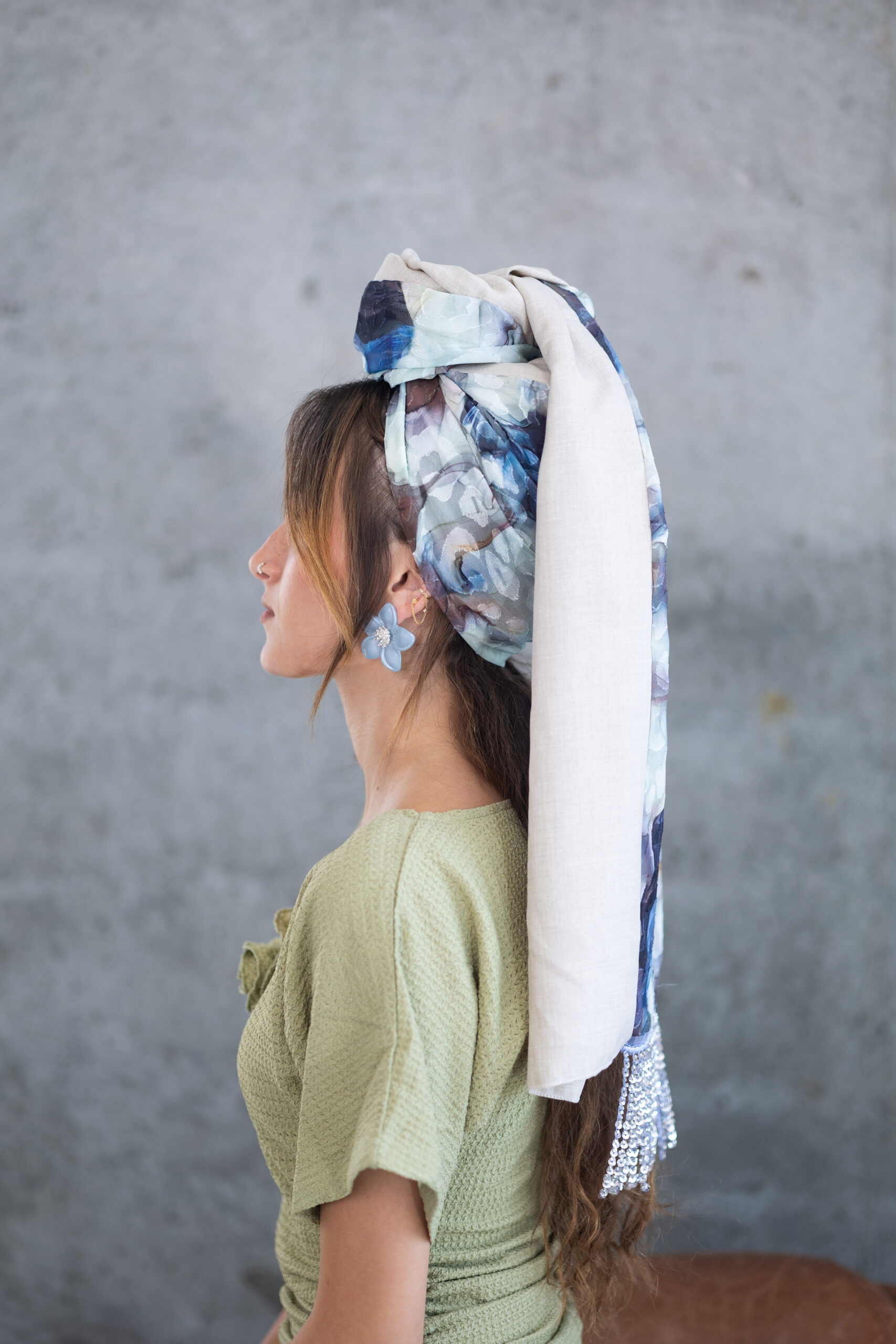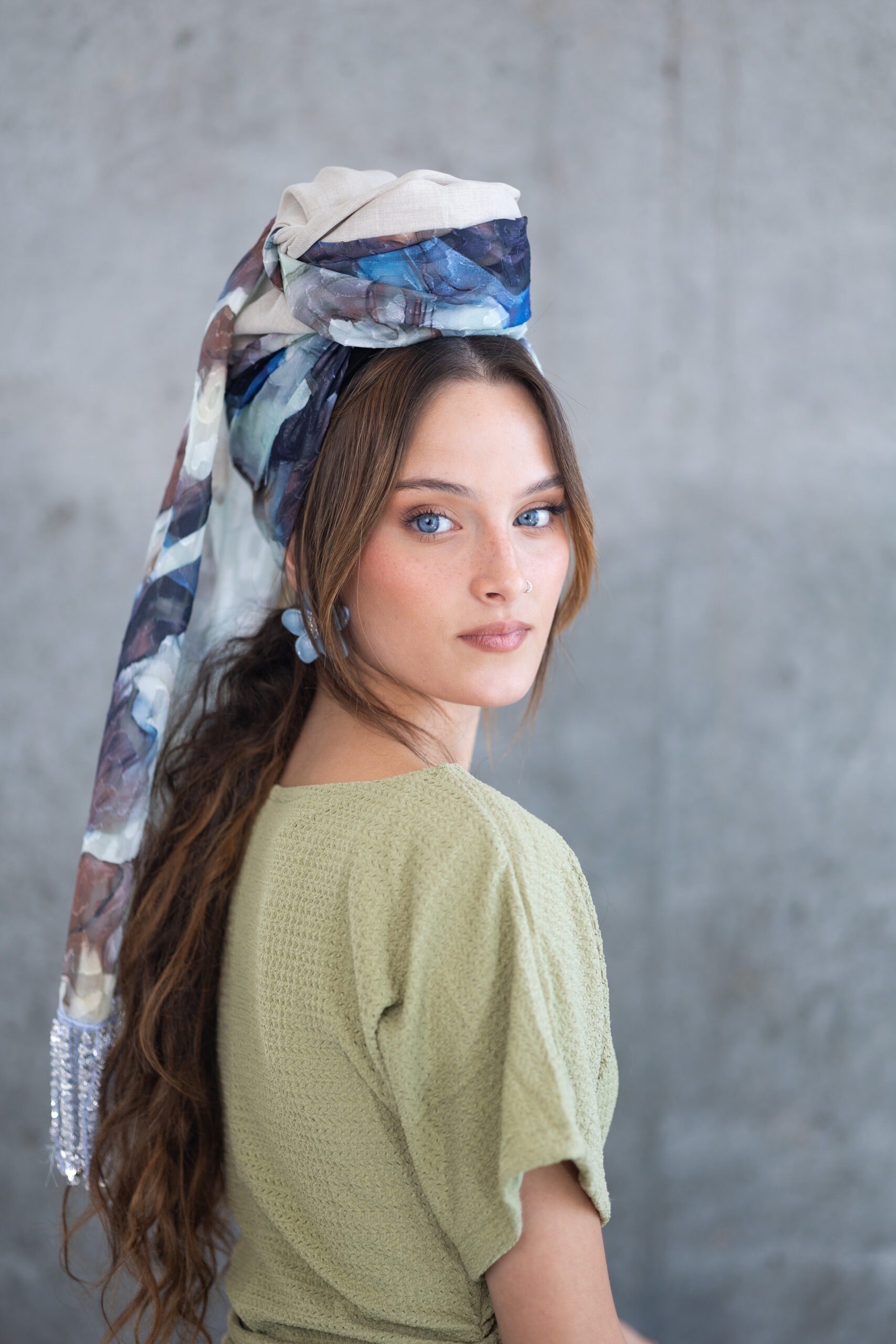 מטפחת לונג "קמיל" היא יצירה אמנותית המשלבת שלווה, עומק וסטייל מודרני, שמתאים במיוחד לאווירה הים תיכונית הרגועה של עתלית והסביבה. היא נוצרה עבור מי שרוצה להרגיש מחוברת לטבע ולים, עם טאץ' של יוקרה עדינה. המטפחת משלבת שני חלקים שונים שיוצרים יחד מראה הרמוני ומרתק: בסיס פשתן טבעי: בד פשתן בגוון בז' בהיר ורך, המעניק מראה טבעי, נושם ויומיומי. הוא משמש כרקע שליו ונעים לחלק השני.