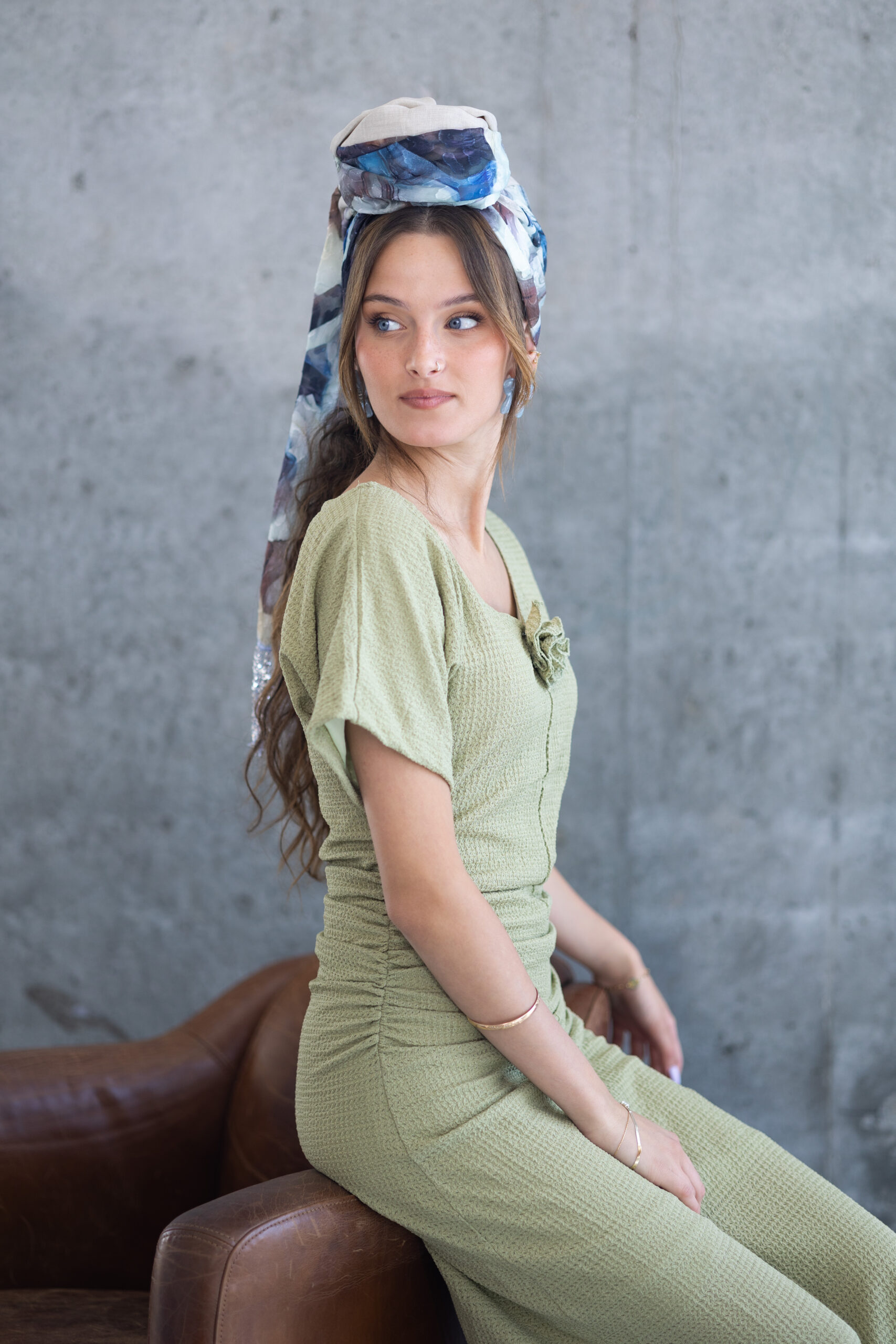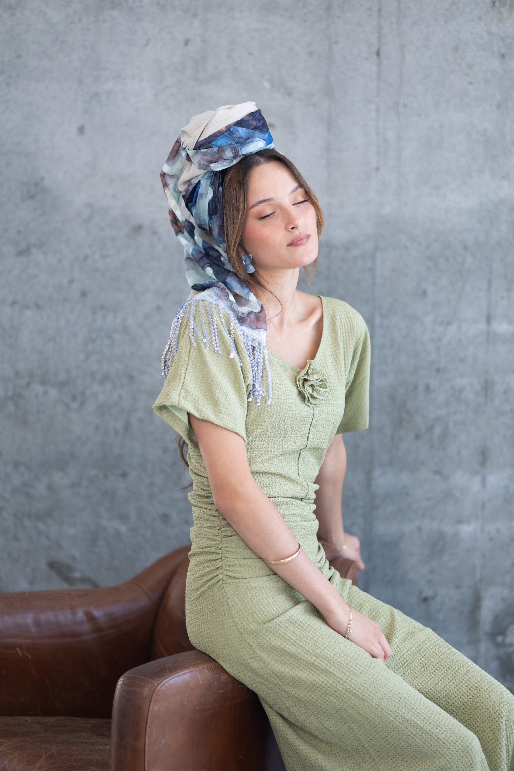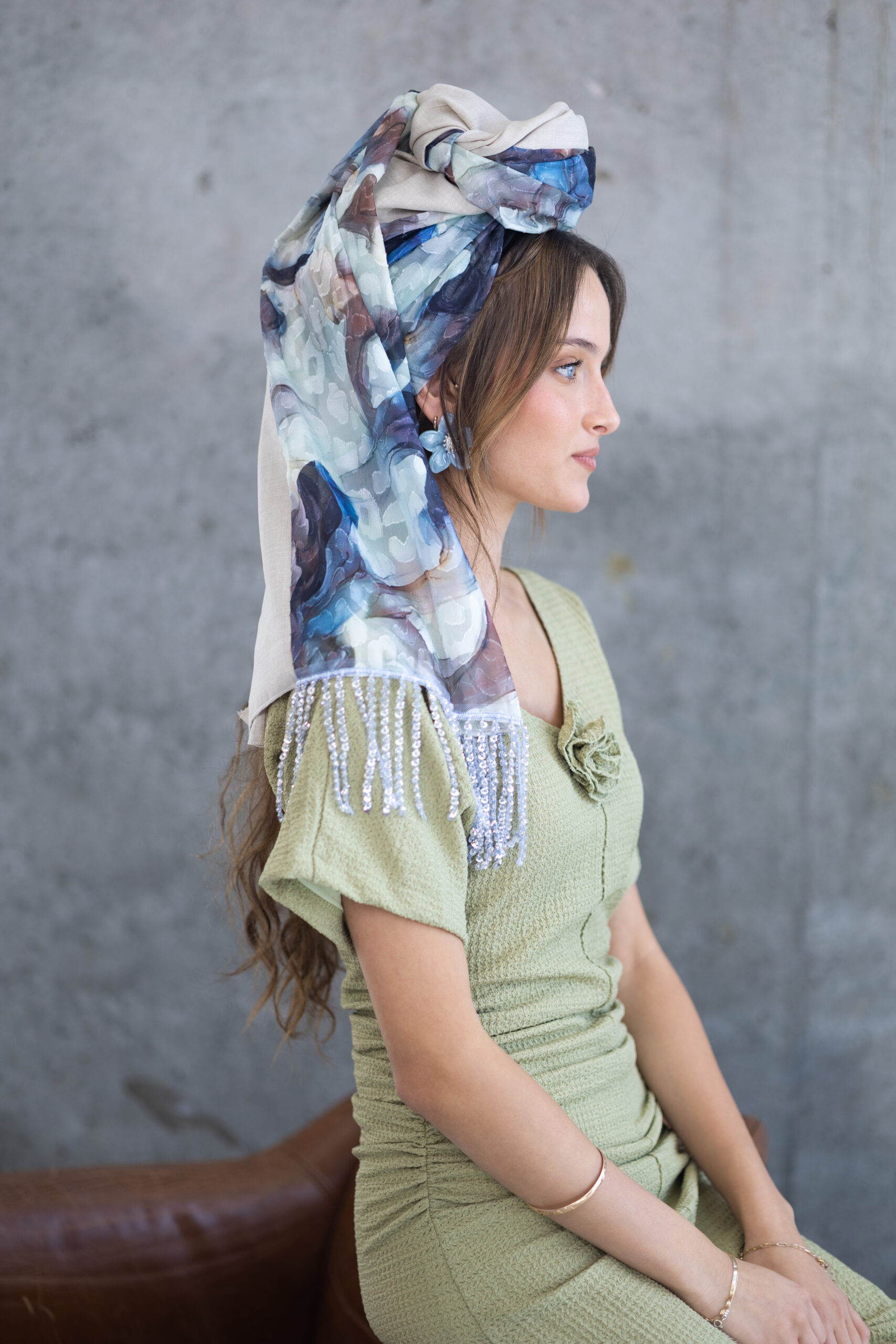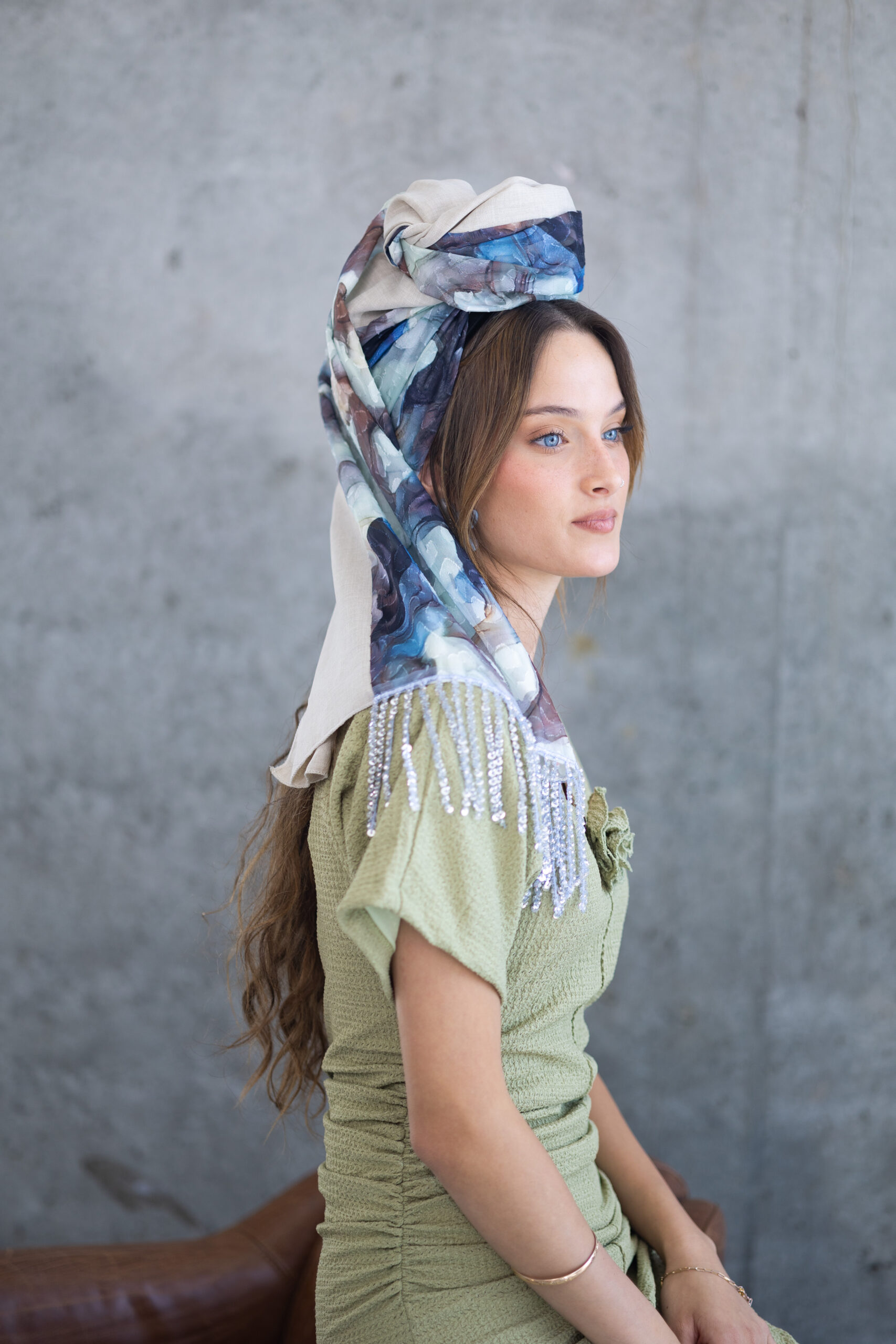 מטפחת לונג "קמיל" היא יצירה אמנותית המשלבת שלווה, עומק וסטייל מודרני, שמתאים במיוחד לאווירה הים תיכונית הרגועה של עתלית והסביבה. היא נוצרה עבור מי שרוצה להרגיש מחוברת לטבע ולים, עם טאץ' של יוקרה עדינה. המטפחת משלבת שני חלקים שונים שיוצרים יחד מראה הרמוני ומרתק: בסיס פשתן טבעי: בד פשתן בגוון בז' בהיר ורך, המעניק מראה טבעי, נושם ויומיומי. הוא משמש כרקע שליו ונעים לחלק השני.