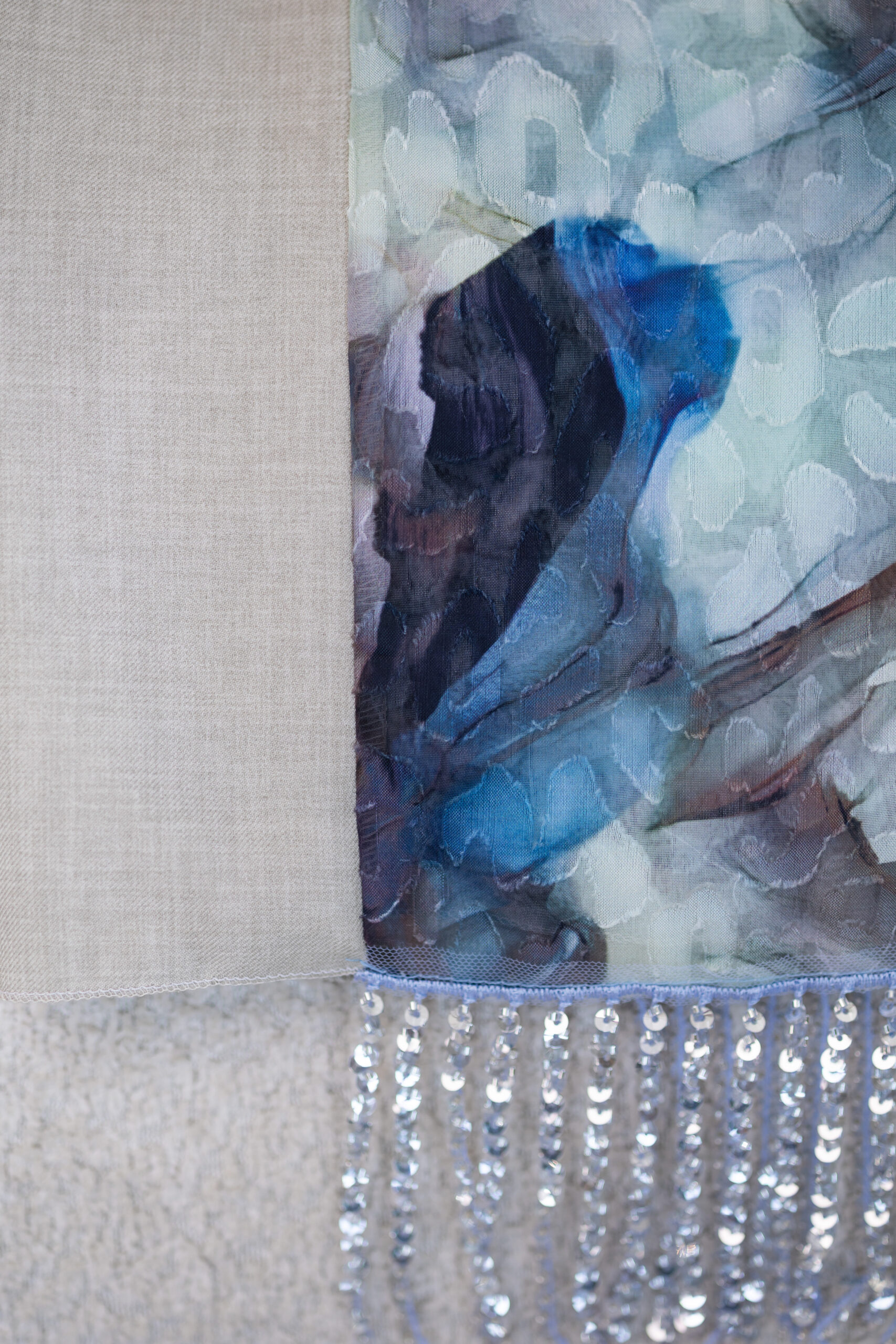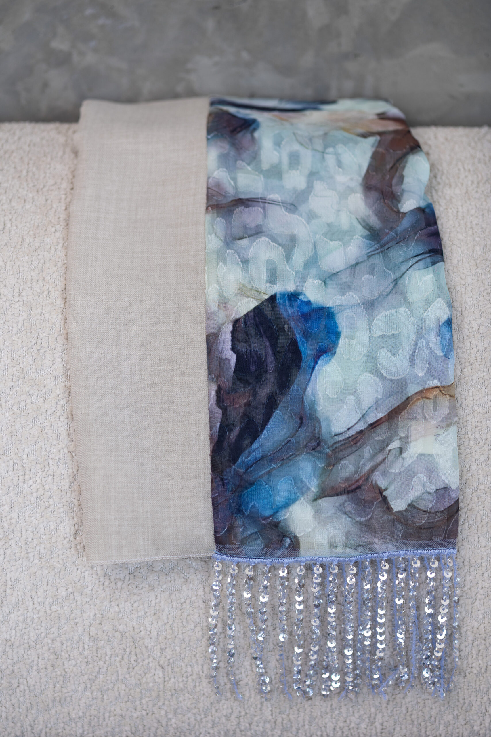 הדפס אבסטרקטי כחול-אפור: בד נשפך ורך עם הדפס ציורי אבסטרקטי בגווני כחול-ים, אפור, חום ונגיעות של לבן. ההדפס מעניק תחושה של מים זורמים או שמיים דרמטיים, ומכניס עומק ורעננות. בקצה פרנז פייט תכלת מרהיב