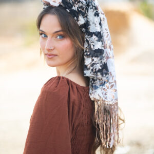 הגוון של הבד הוא כחול-אפור בהיר (כמעט תכלת מעושן) בצבעי ה"טאי דאי" הרכים ברקע. השילוב של הבסיס המעורפל עם הרקמה הלבנה החדה מעניק עומק וממדים לבד, ויוצר מראה רומנטי, אוורירי ומלא אופי. זוהי מטפחת אידיאלית לחורף המנומנם שבדרך, מושלמת למי שמחפשת נוכחות עדינה ואלגנטית עם נגיעה של וינטג' נצחי.
