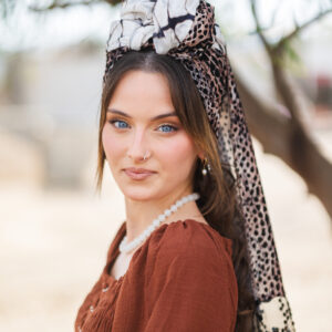 הגוון של הבד הוא כחול-אפור בהיר (כמעט תכלת מעושן) בצבעי ה"טאי דאי" הרכים ברקע. השילוב של הבסיס המעורפל עם הרקמה הלבנה החדה מעניק עומק וממדים לבד, ויוצר מראה רומנטי, אוורירי ומלא אופי. זוהי מטפחת אידיאלית לחורף המנומנם שבדרך, מושלמת למי שמחפשת נוכחות עדינה ואלגנטית עם נגיעה של וינטג' נצחי.
